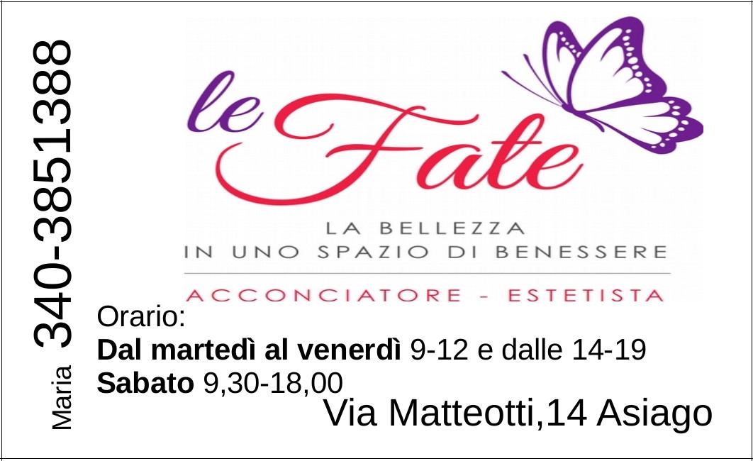 Il nostro salone si trova a pochi passi dal centro storico di Asiago. Al suo interno potrete trovare trattamenti di parrucchiera, ma anche di estetica base. La nostra filosofia di bellezza si fonda soprattutto sulla cura ed il benessere dei capelli. Inoltre, la cosa più importante per noi sono i CLIENTI. Ogni cliente che entra nel Salone Le Fate è curato e coccolato dai capelli ai piedi!!!